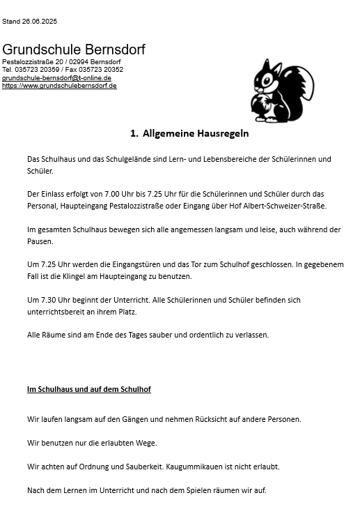 Er wurde am 14.05.2025 in der Schulkonferenz der Grundschule Bernsdorf einstimmig beschlossen und gilt bis auf Weiteres in der vorliegenden Form für 2 Jahre.