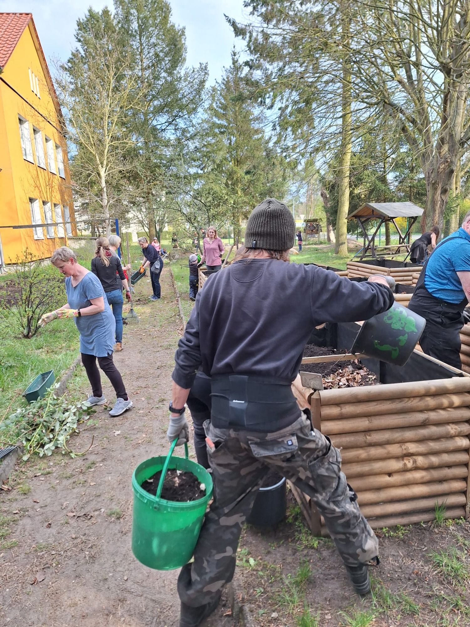 Im Schulgarten beseitigten die vielen Helfer die Spuren des Winters. Es wurden die Flächen vom Laub befreit, Hochbeete mit neuer Erde befüllt, Beerensträucher verschnitten und neue Himbeeren gepflanzt, umgegraben, der Tastpfad erneuert und die Totholzhecke bestückt.