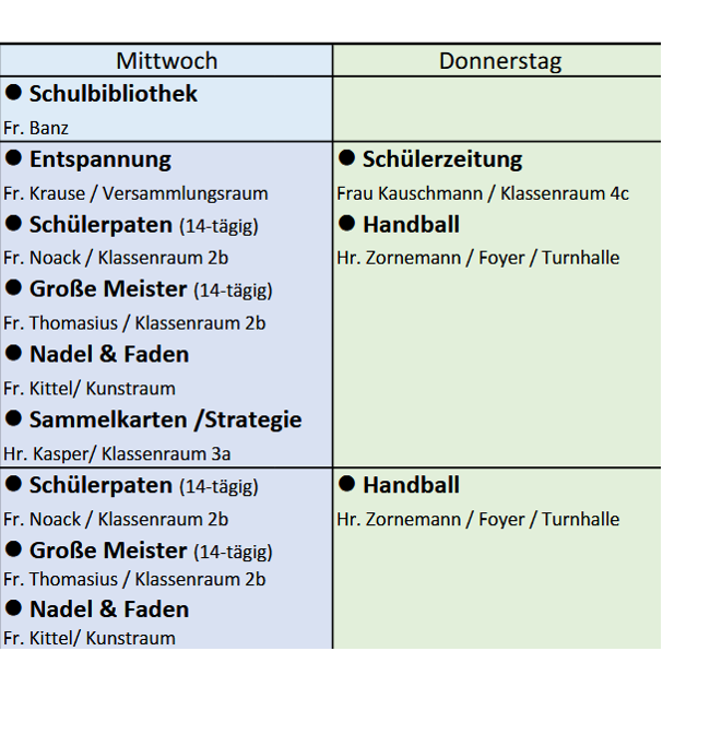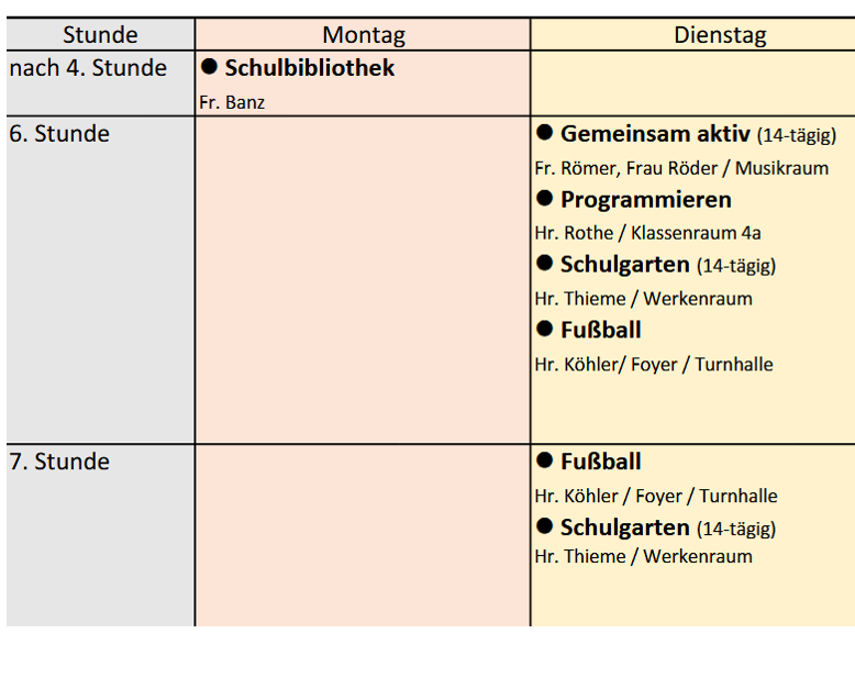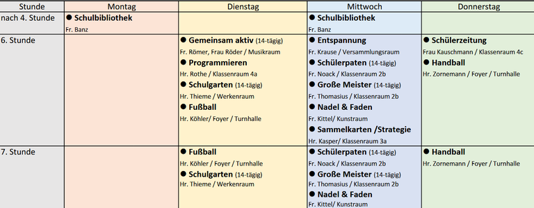 Bis einschließlich 5. Stunde haben die Schülerinnen und Schüler an GTA-Tagen dann verbindlich Unterricht bzw. Förderunterricht (in der Ausnahme auch Betreuung, falls erforderlich, z.B. bei unvorhergesehenem Ausfall), wenn sie an einer GTA teilnehmen. So kann ein nahtloser Übergang zum GTA-Beginn gewährleistet werden.